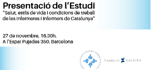 El Consell de Col·legis d’Infermeres i Infermers de Catalunya (CCIIC) i la Fundació Galatea presenten el proper 27 de novembre l’estudi “Salut, estils de vida i condicions de treball de les infermeres i infermers de Catalunya”.Es tracta d’un estudi transversal que proporciona informació clau per entendre quines són les condicions de salut i treball de les infermeres catalanes en un context de crisi econòmica que afecta directament als indicadors de salut del col·lectiu.