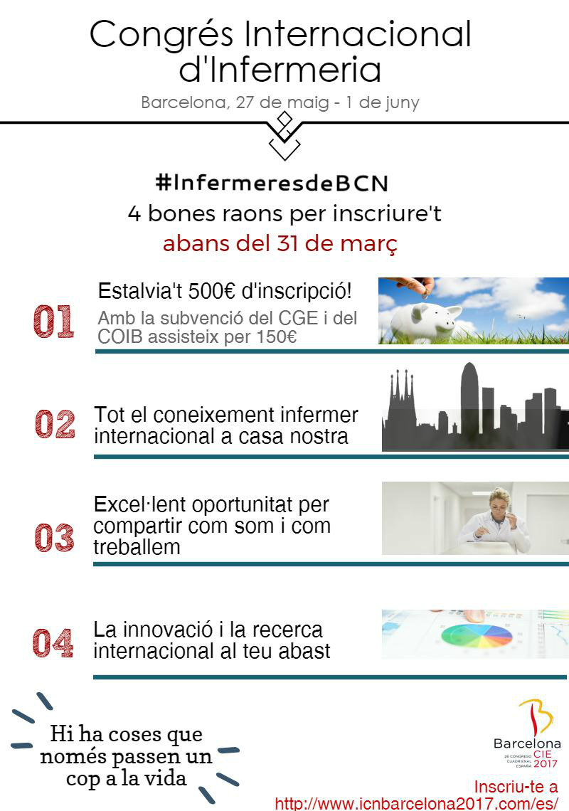 Al mes de març finalitza el període perquè les infermeres i infermers col·legiats facin la inscripció avançada al Congrés Internacional d’Infermeria de Barcelona estalviant-se 500 € del preu de la quota a través del codi promocional del Consejo General de Enfermería i la subvenció posterior del COIB. Una oportunitat única d’accedir al coneixement infermer mundial amb condicions excepcionals.