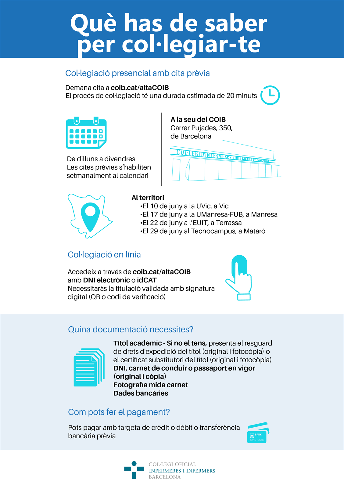 Per tal d’apropar i facilitar aquest tràmit a les infermeres i infermers que resideixen al territori, el COIB realitzarà col·legiacions fora de la seva seu a les ciutats de Vic, el 10 de juny; Manresa, el 17 de juny; Terrassa, el 22 de juny; i Mataró, el 29 de juny. Per aquest tràmit, és imprescindibledemanar cita prèviaen aquest calendari. Si s'utilitza un ordinador o dispositiu no personal, s'ha de tancar el navegador i esborrar l'historial.